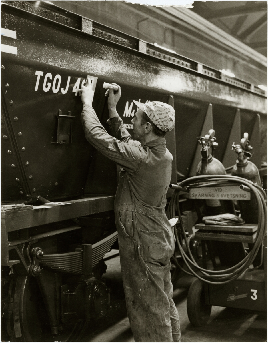 Trafikaktiebolaget Grängesberg - Oxelösunds Järnvägar, TGOJ M4 malmvagn numreras på verkstaden i Eskilstuna.