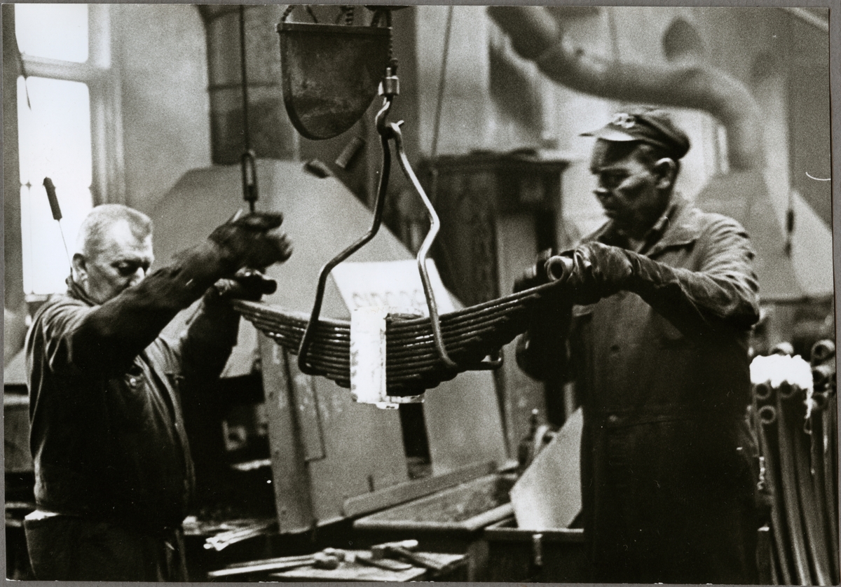 Tillverkning av bärfjäder i Trafikaktiebolaget Grängesberg - Oxelösunds Järnvägar, TGOJ verkstad i Kopparberg.