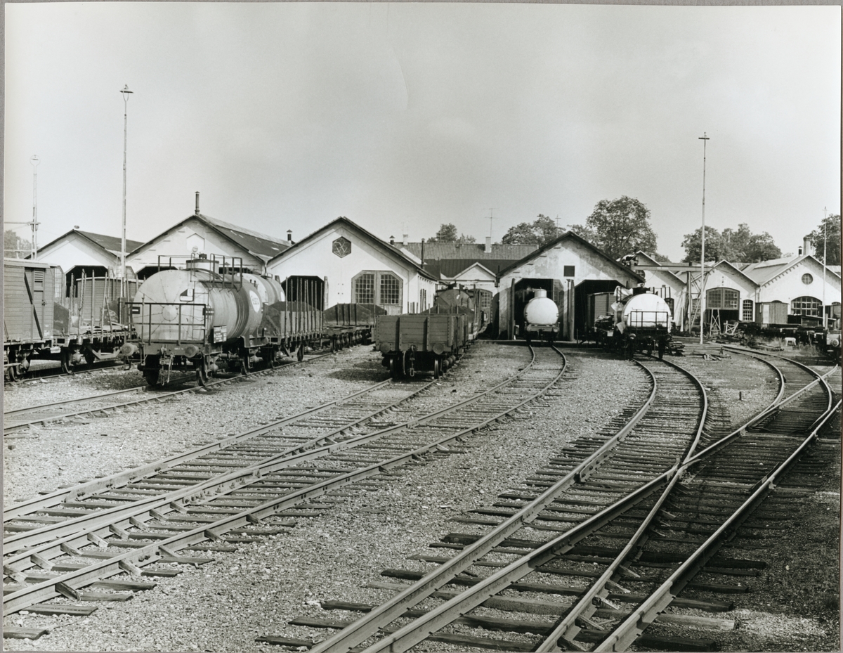 Vy över bangården vid Frövi - Ludvika Järnväg, FLJ verkstad i Kopparberg.