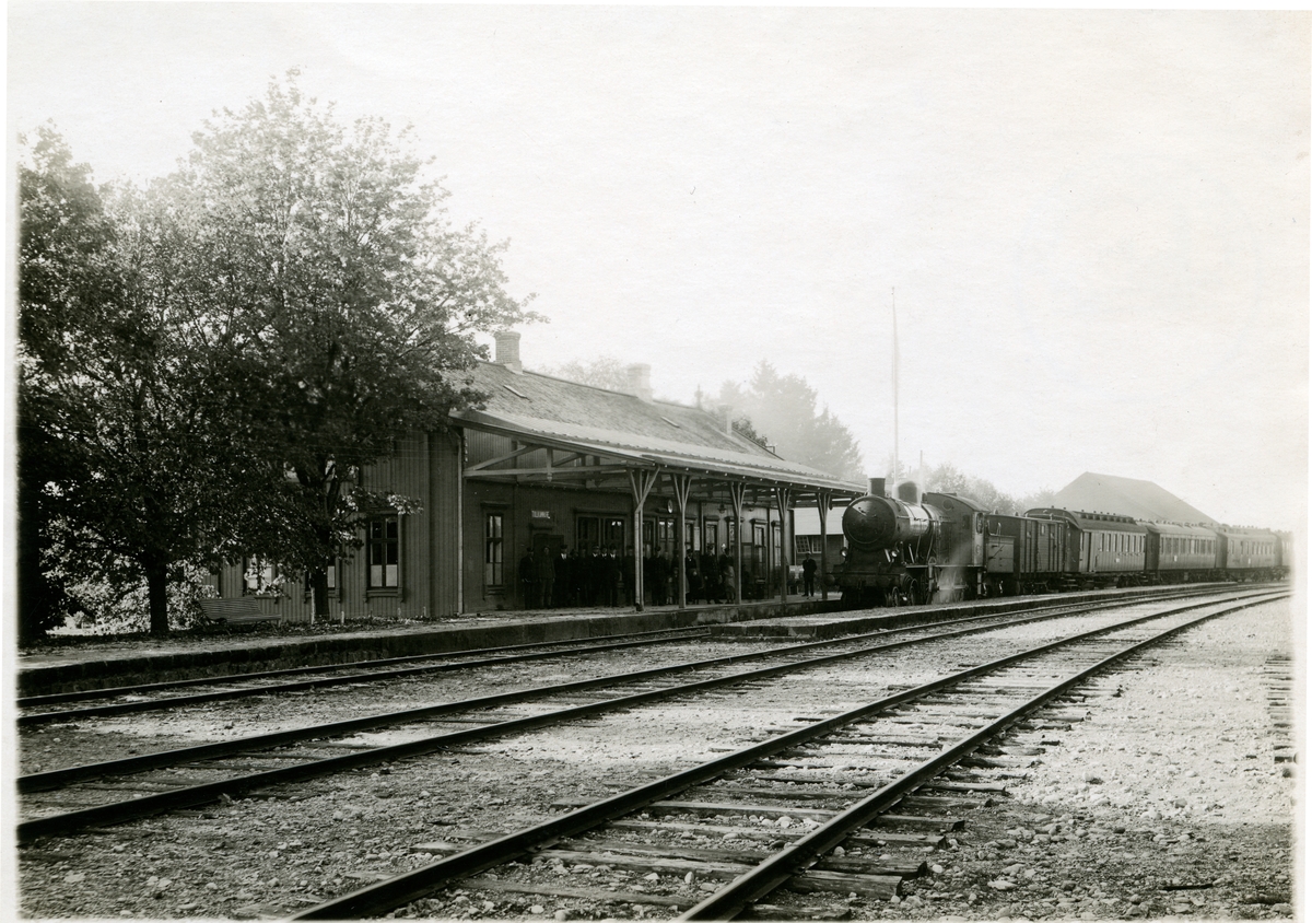 Envånings stationshus med väntpaviljong mot plattformen. Stationshuset nu rivet .Stationen, som är gränsstation mot Norge, anlades 1879. Envånings stationshus i trä. Mekanisk växelförregling .