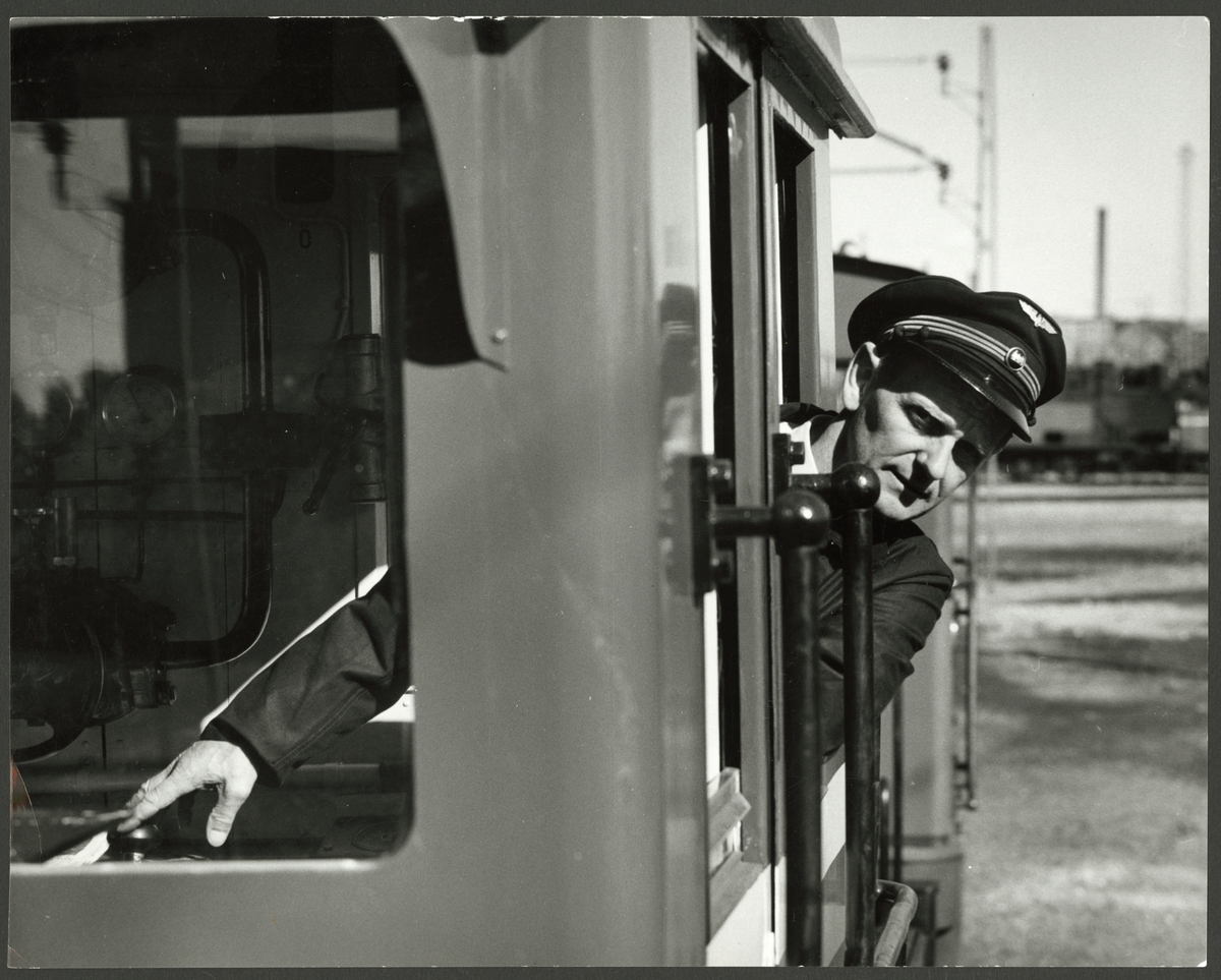 Lokförare lutar sig ut från Trafikaktiebolaget Grängesberg - Oxelösunds Järnvägar, TGOJ Ma 404.