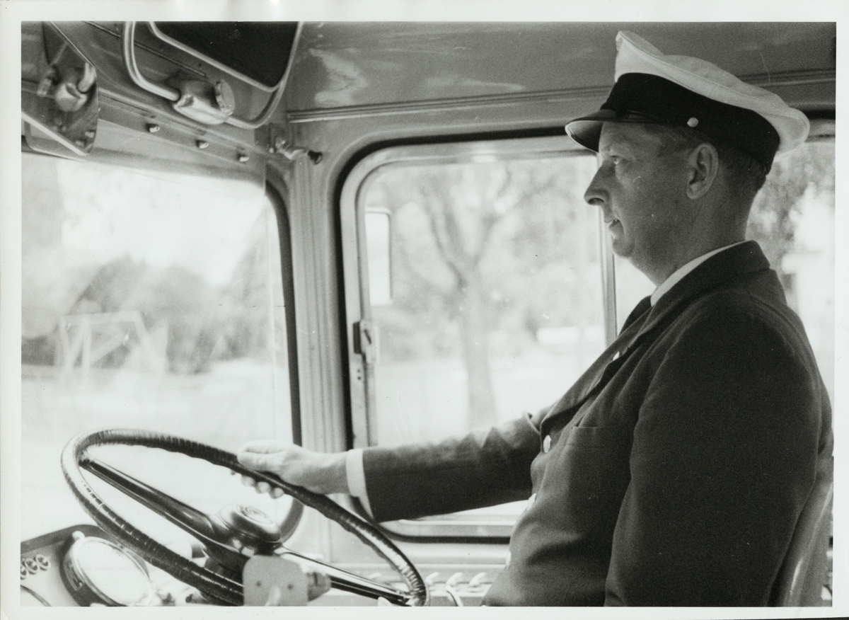 Helge Lindqvist bakom ratten på en Trafikaktiebolaget Grängesberg - Oxelösunds Järnvägar, TGOJ buss.