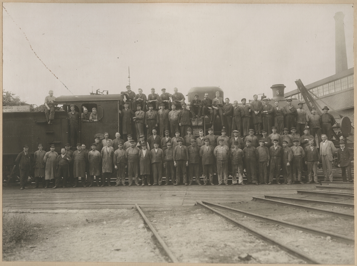 Personal samlad på och runt Oxelösund - Flen - Västmanlands Järnväg, OFWJ M3 50.