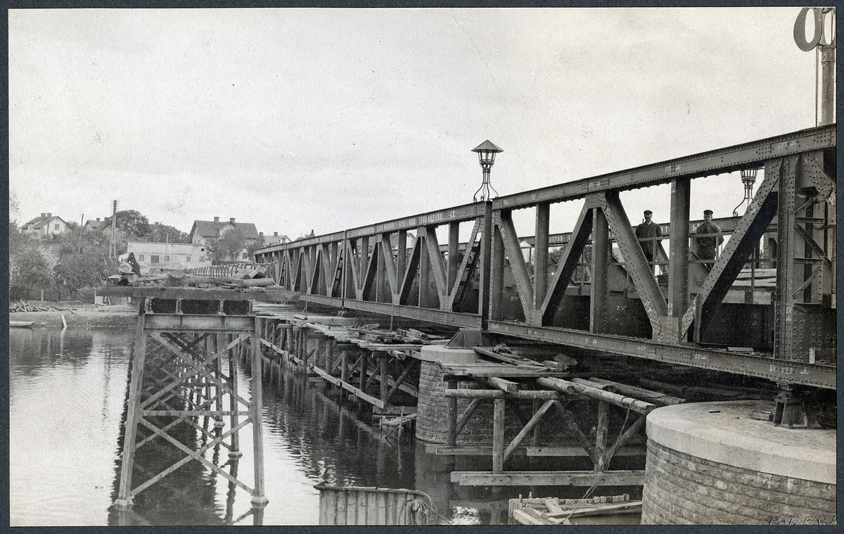 Järnvägsbron över Stångån vid Linköping. Ställningsbyggnaderna och överbyggnaden. Äldre bro syns till vänster.