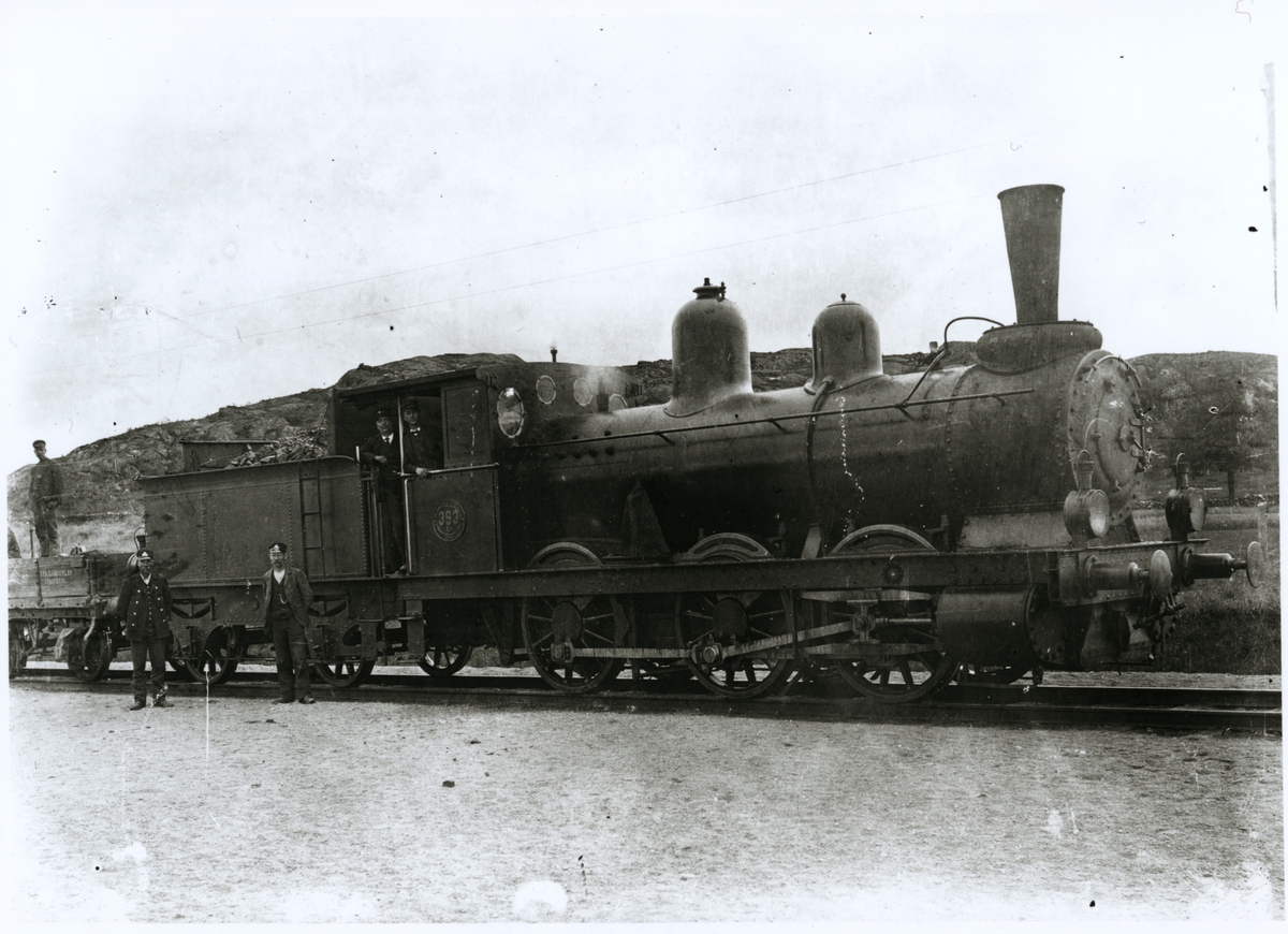 Profilbild på ånglok och tender med personal i bild.