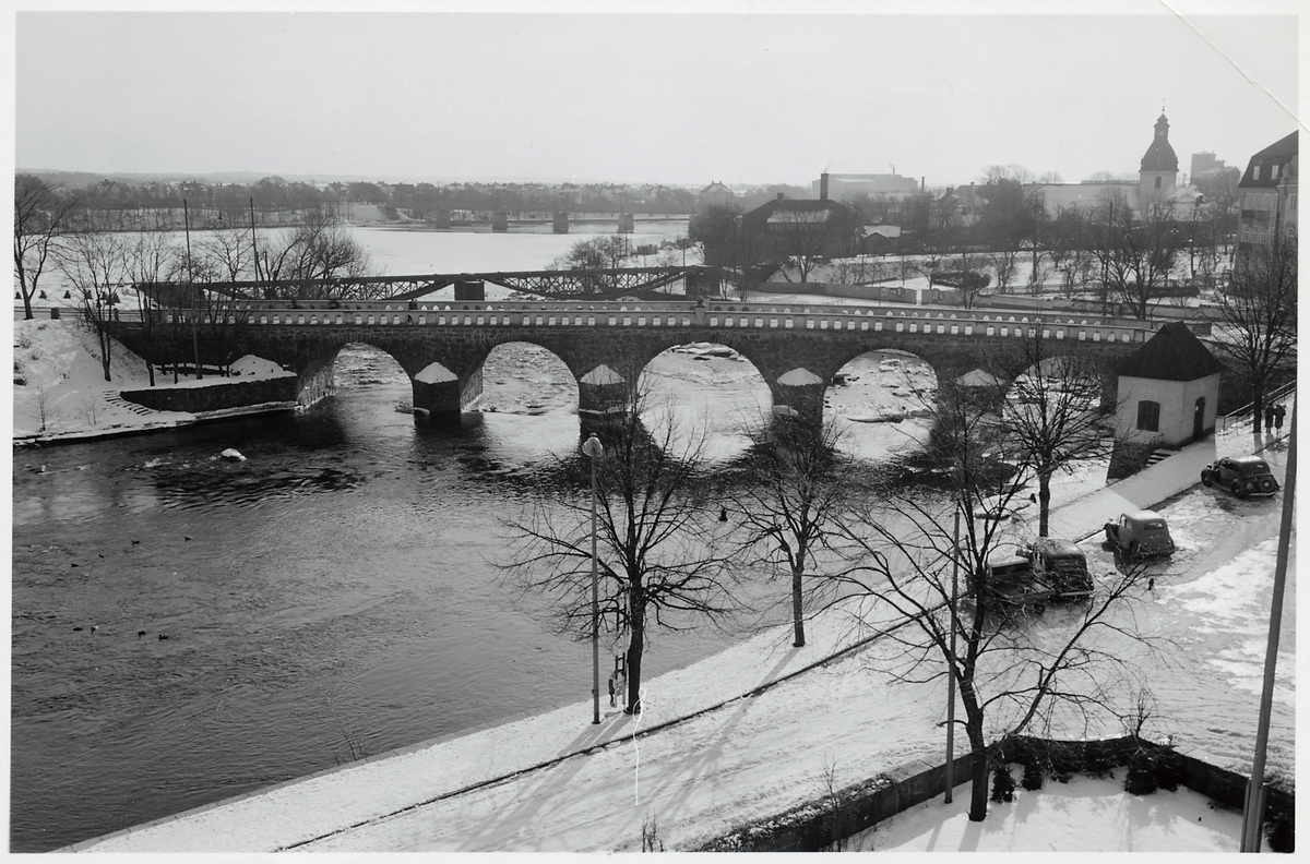 Tre broar över Ätran i Falkenberg. Närmast i bild Tullbron, stenvalvsbro från 1761, därefter den gamla järnvägsbron 1886-1937 och längst bort i bild den nya järnvägsbron 1936-2009.