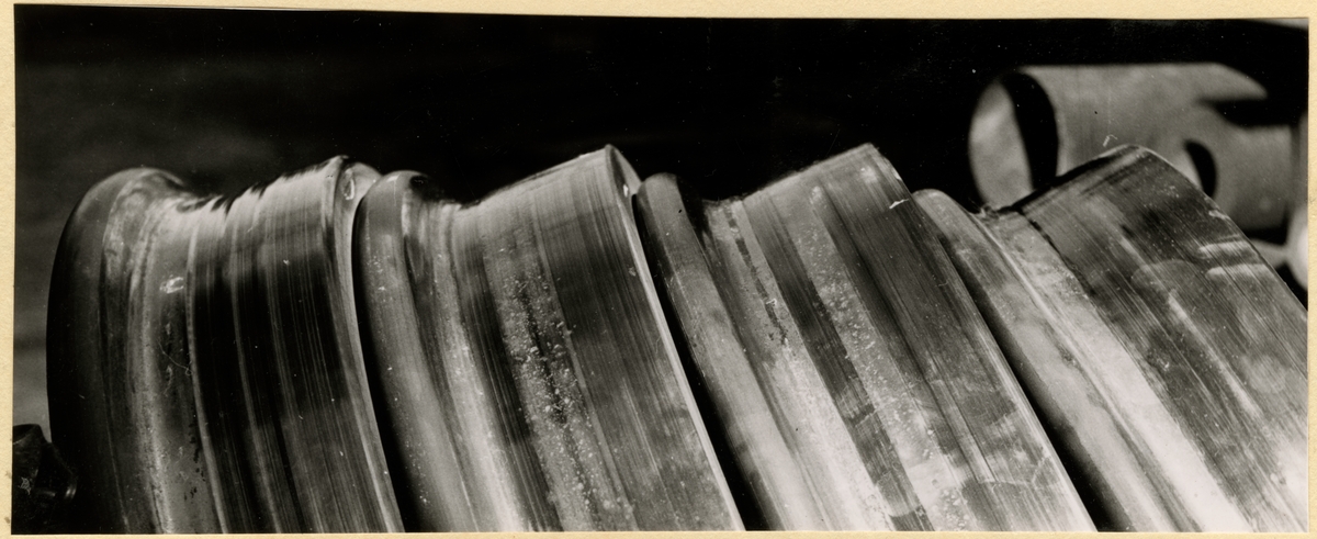 Titel: Hjul borttagna i samband med skadade bromsblock. Spår i hjulen efter bromsblock. Kommer från motorvagn Trafikaktiebolaget Grängesberg - Oxelösunds Järnväg, TGOJ Yoa 104-3.