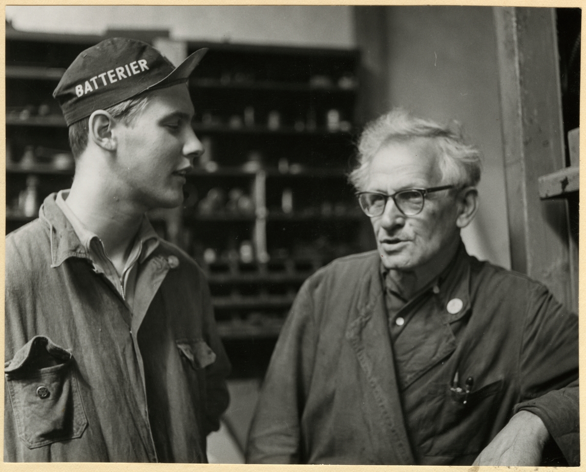 Två verkstadsarbetare vid Trafikaktiebolaget Grängesberg - Oxelösunds Järnväg, TGOJ verkstad i Eskilstuna.