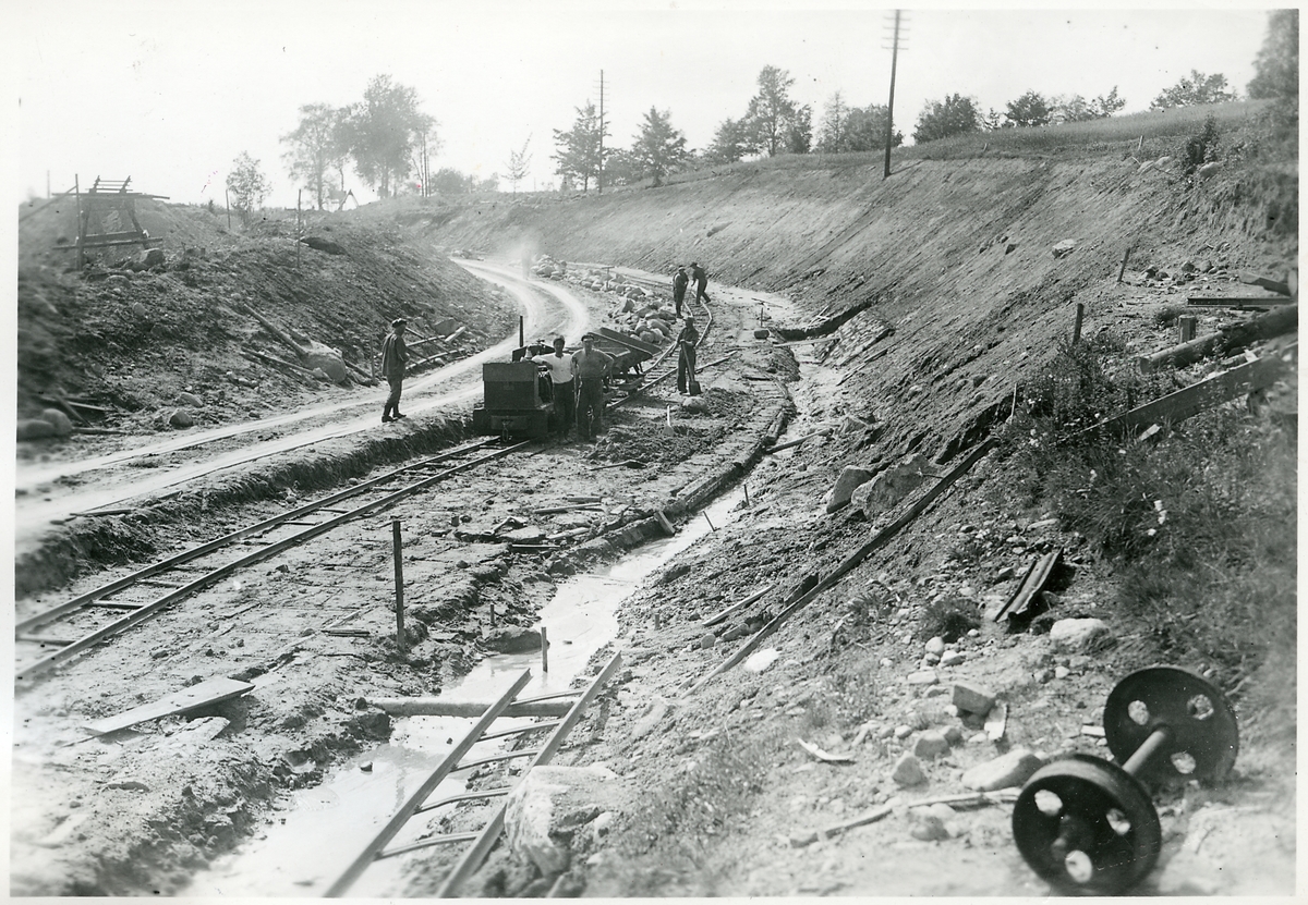 Järnvägsanläggning vid Djupadal. Decauvillespår, de färdiga rälsbitarna användes som provisoriska banor för banarbetsfordon.
