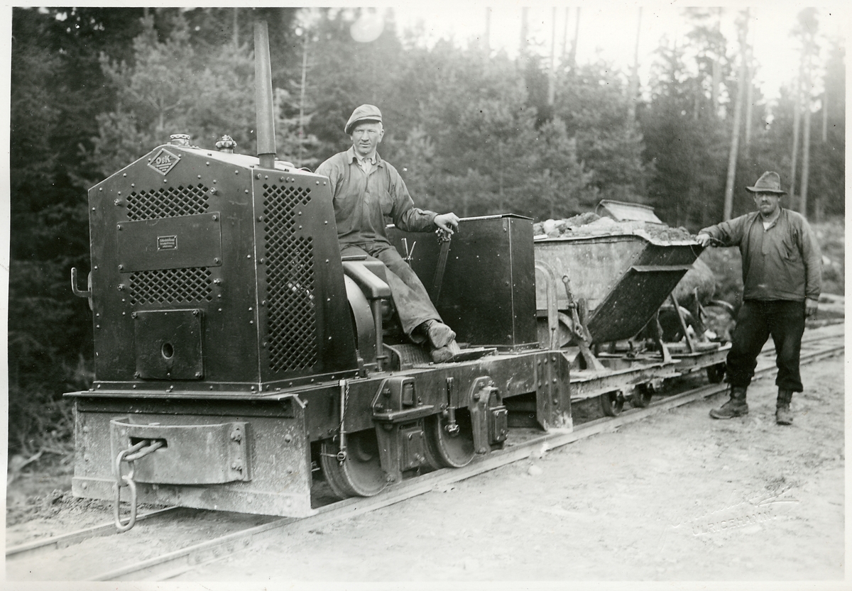 Titel: Järnvägsanläggning vid Djupadal. Jordtransport med Deutz-loket.