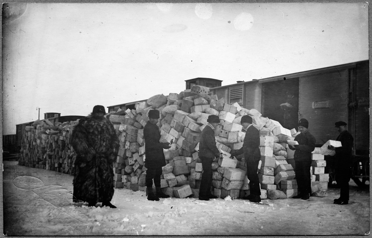 Paketgods lastas ut vid Hapranda skeppsbro under Första världskriget.