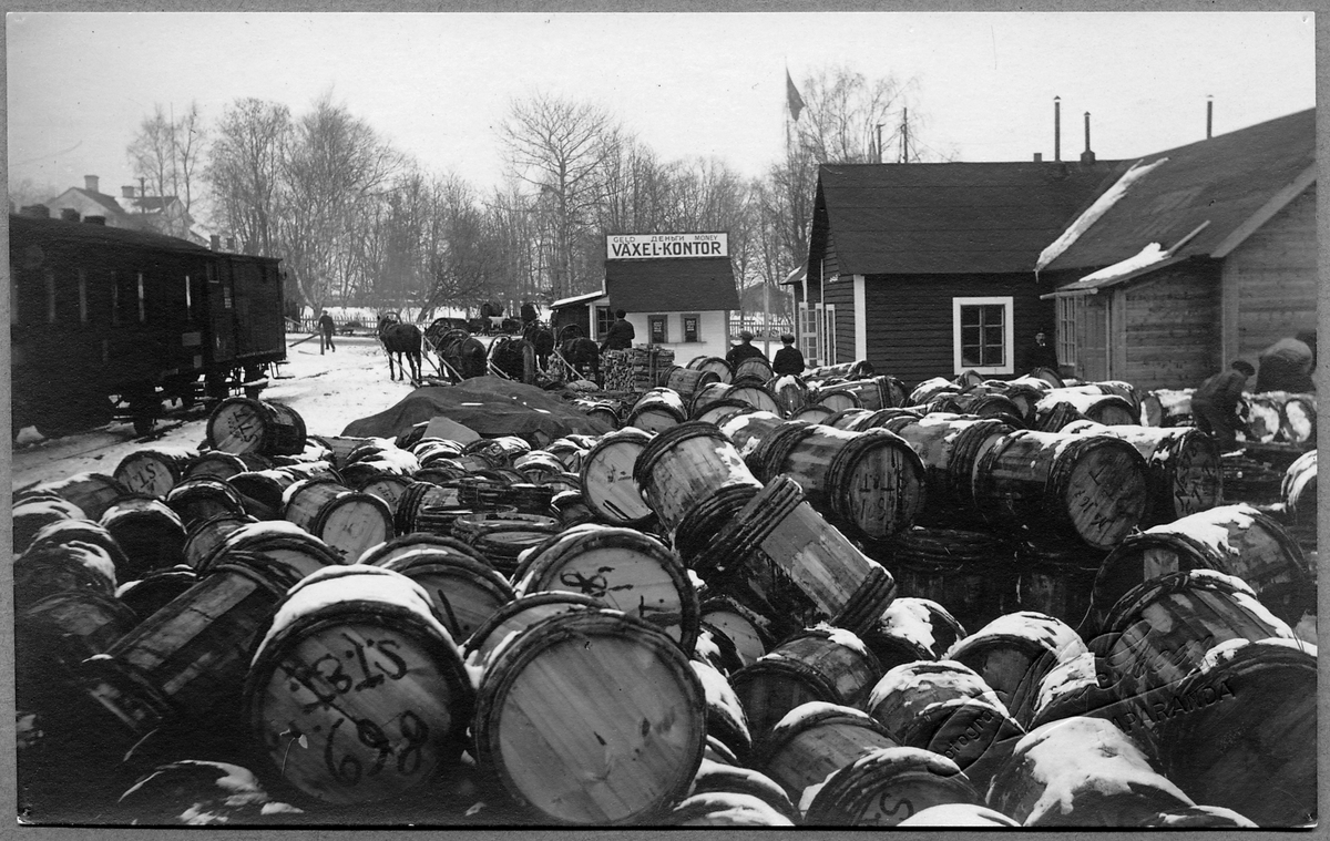 Upplag med fraktgods vid Haparanda hamnspår under Första världskriget.