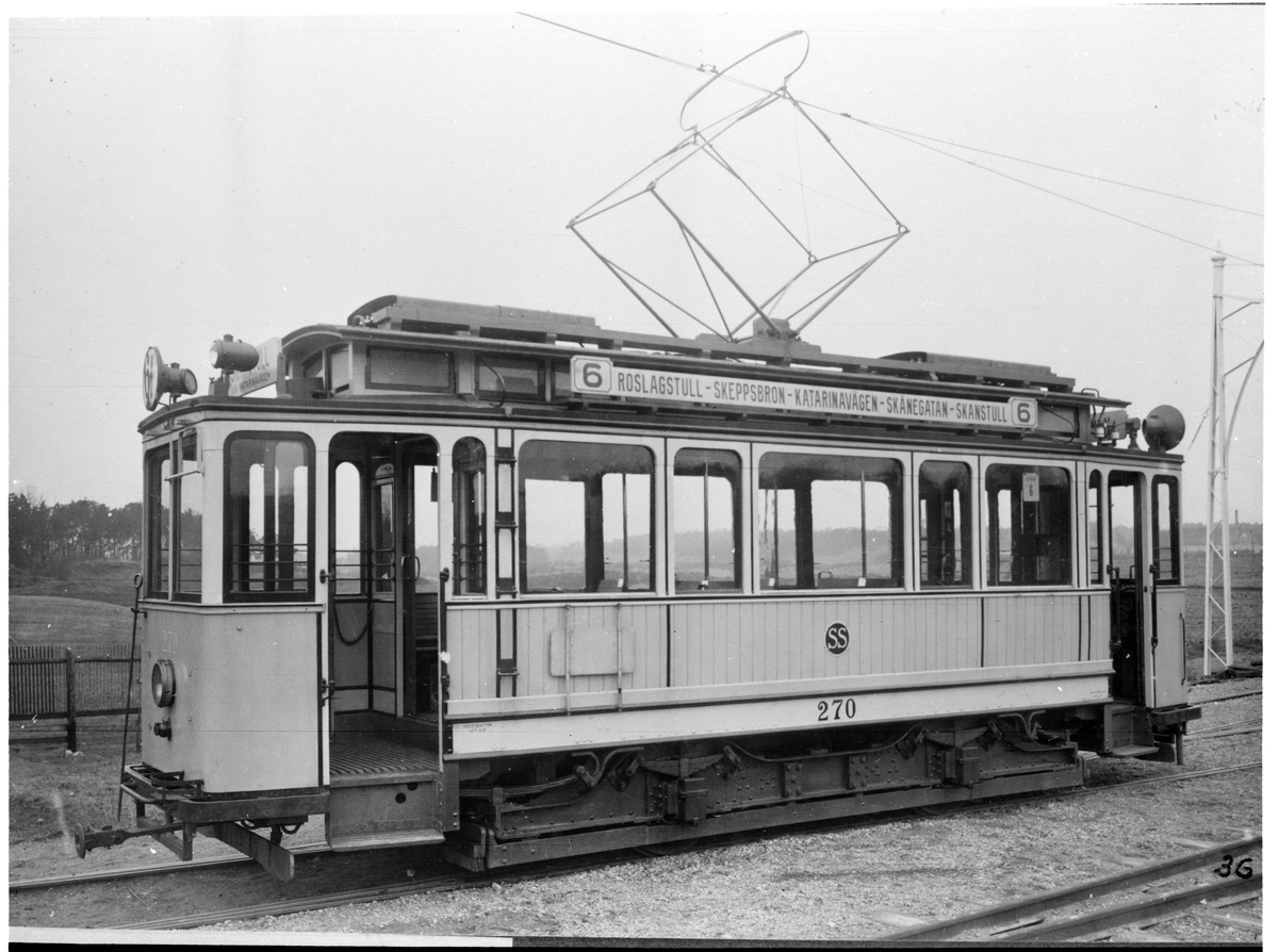 Aktiebolaget Stockholms Spårvägar, SS A10 270, linje 6, som gick mellan Roslagstull och Skanstull. Fotograferad vid Hagalund järnvägsstation.