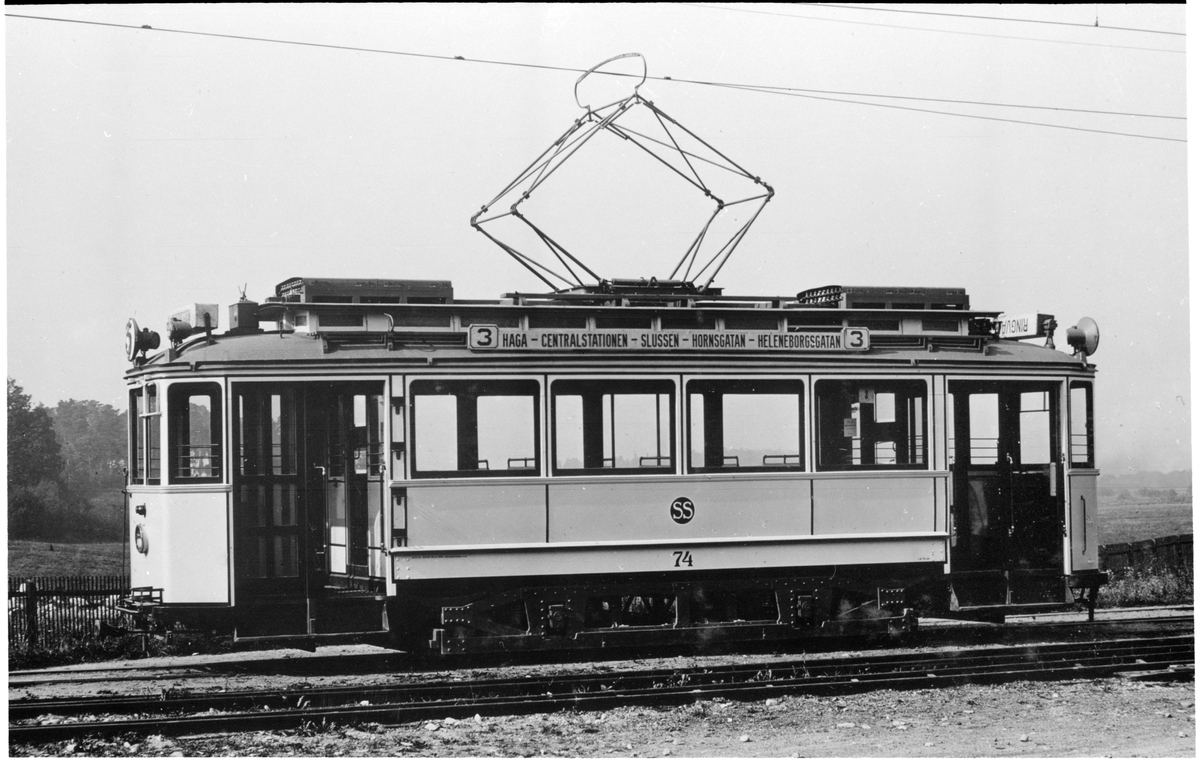 Aktiebolaget Stockholms Spårvägar, SS A1 74, linje 3, som gick mellan Haga och Heleneborgsgatan. Fotograferad vid Hagalund järnvägsstation.