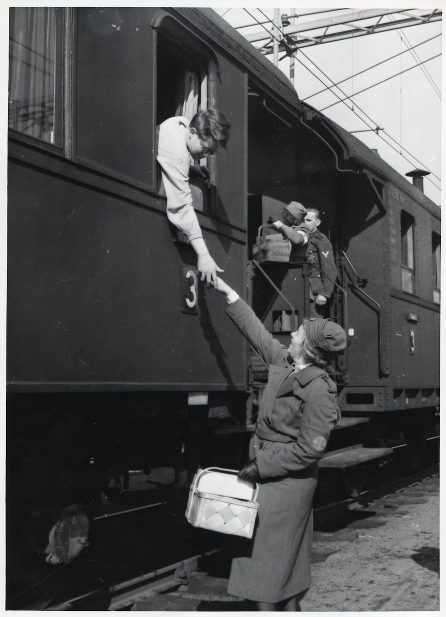 Titel: Medlem ur Lottakåren delar ut förnödenheter till tysk skadad soldat.