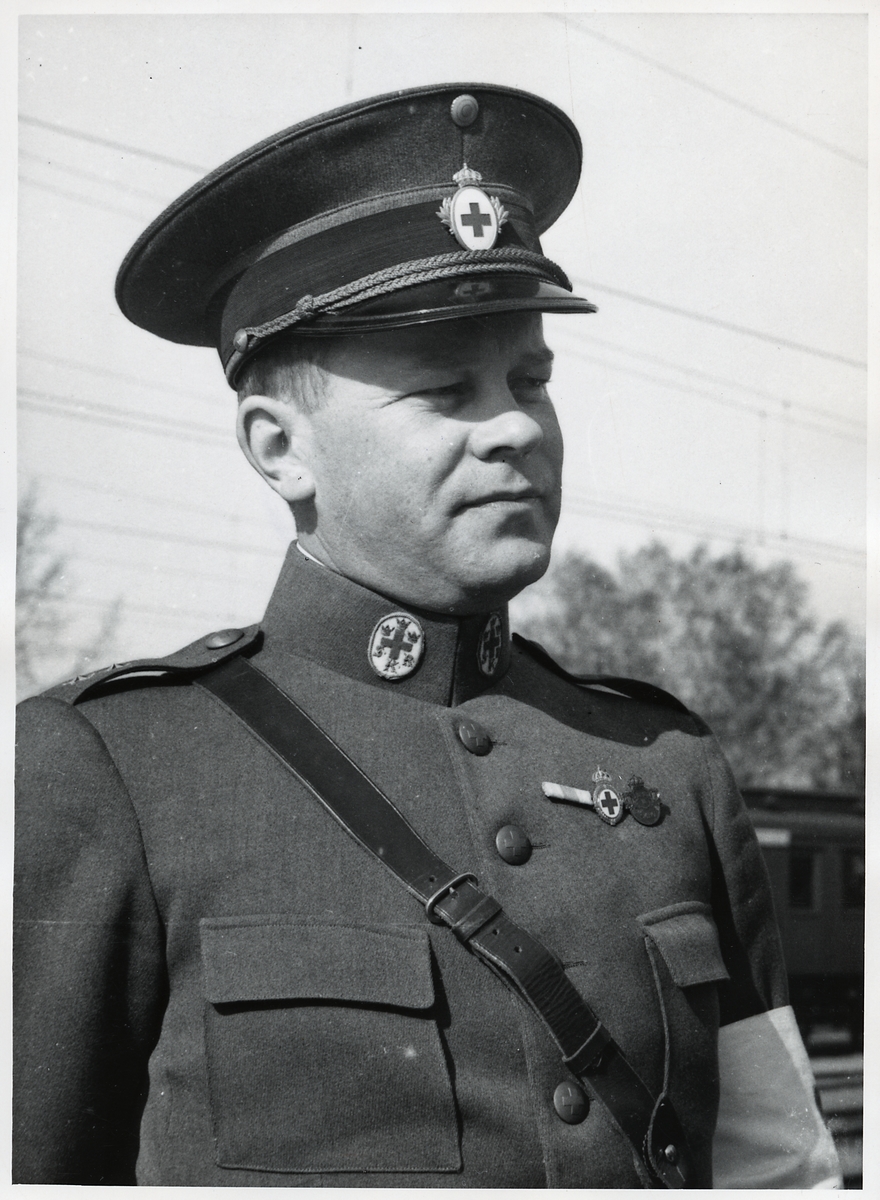 Rödakorslöjtnanten Uno Rehnvall porträtterad i samband med att ett tyskt sjukvårdståg passerar Hallsberg under Andra Världskriget.