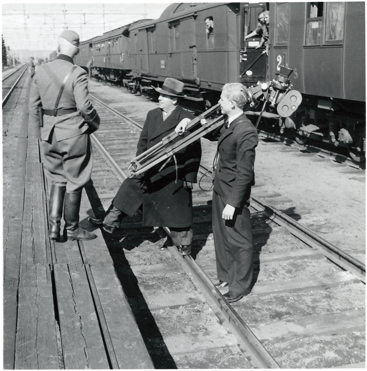 En tysk militär och två svenskar i samspråk på spåret, under krigsutväxlingen.