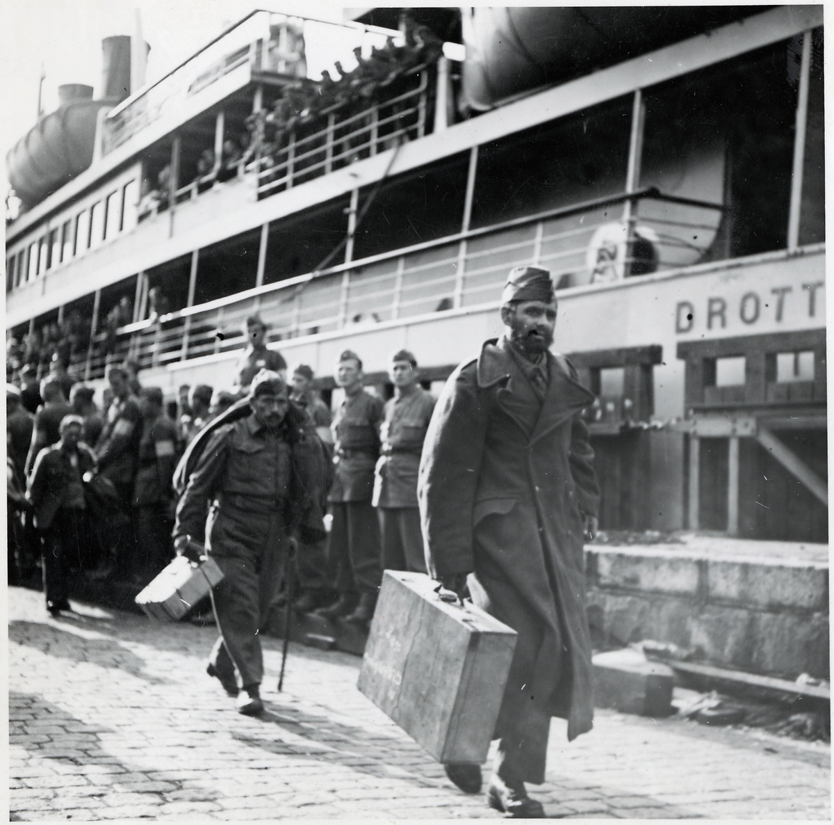 Brittiska krigsfångar går i land i Trelleborg från Drottning Victoria.