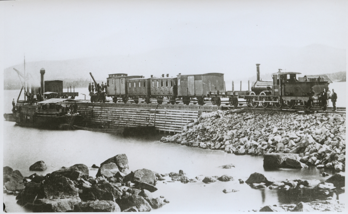 Omlastningsplatsen Kilafors nedre vid sjön Bergviken. Ångloket Statens Järnvägar, SJ F 68 "Finnveden" och fartyget "S/S Bergviken".