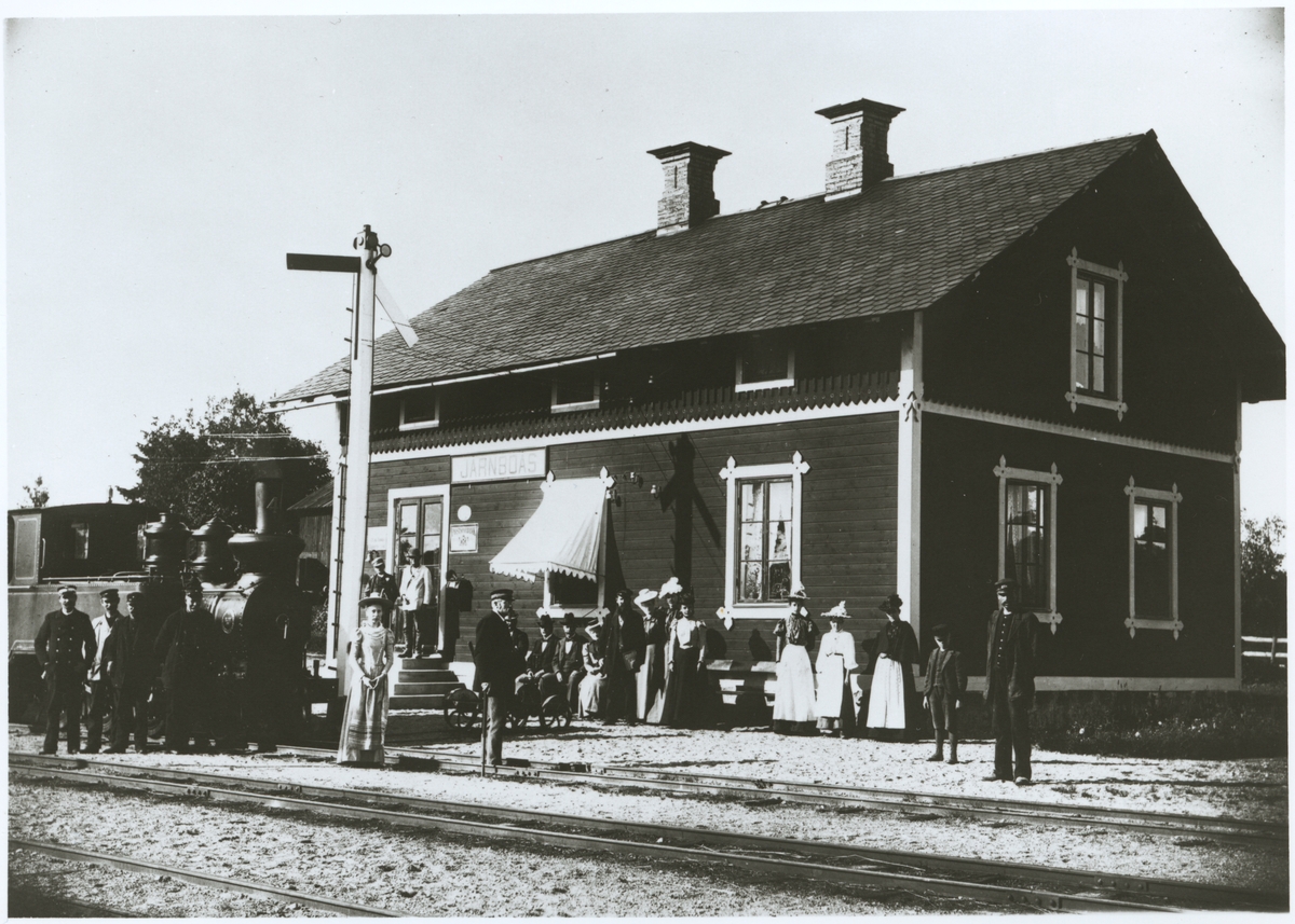Järnvägsstationen i Järnboås med kvinnor och män som poserar utanför. Bredsjö - Degerfors Järnväg, BDJ lok 4 till vänster.