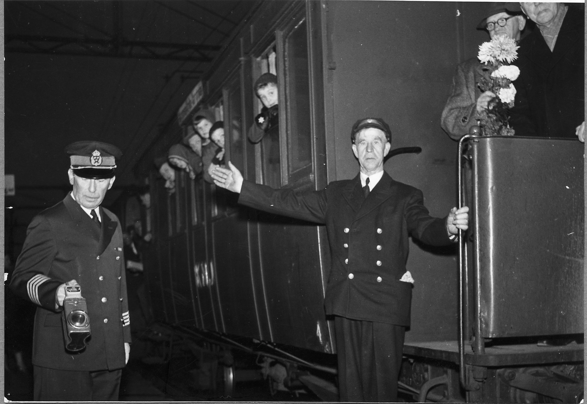 Sista tåget på Krylbo - Norbergs Järnväg. KNJ personvagn 4. Konduktör Lindström står på vagnens trappsteg.