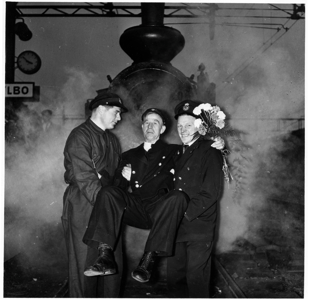Konduktör Johan Lindström bäres i "Guldstol" strax före Krylbo - Norbergs Järnvägs sista avgång. KNJ X2 2 "Bjurfors".
