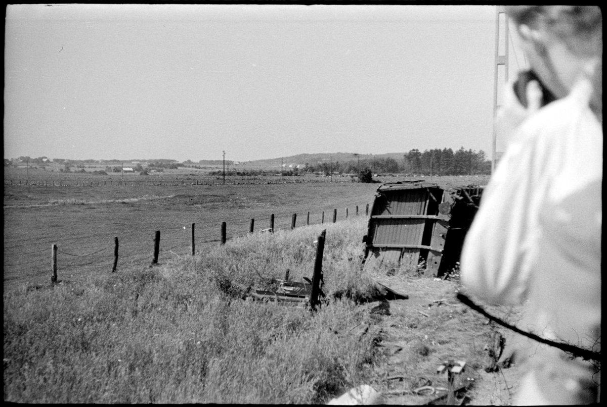 Godsvagn som ligger på sidan bredvid spåret, möjligtvis efter urspårning.