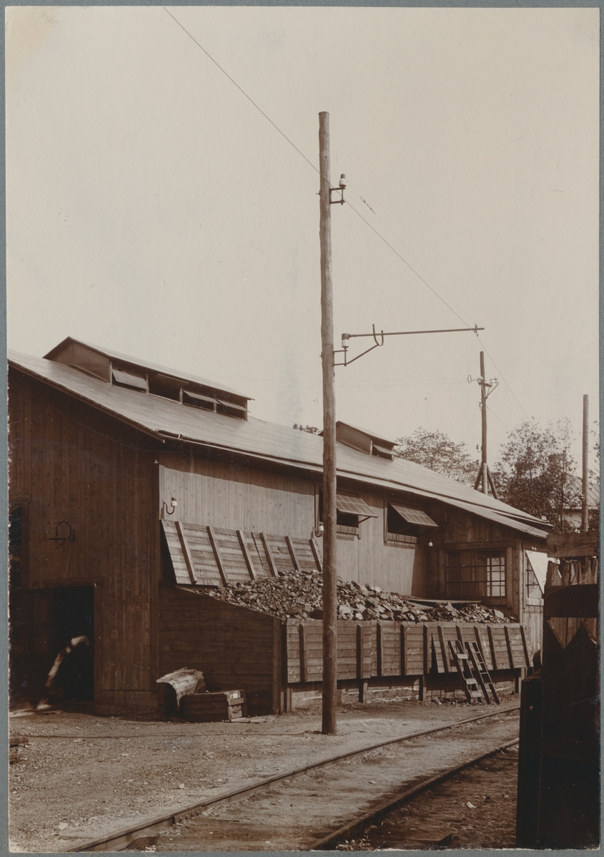 Titel: Försöksbanan Stockholm - Järva. Byggnaden är den provosoriska kraftstationen. Tomteboda.