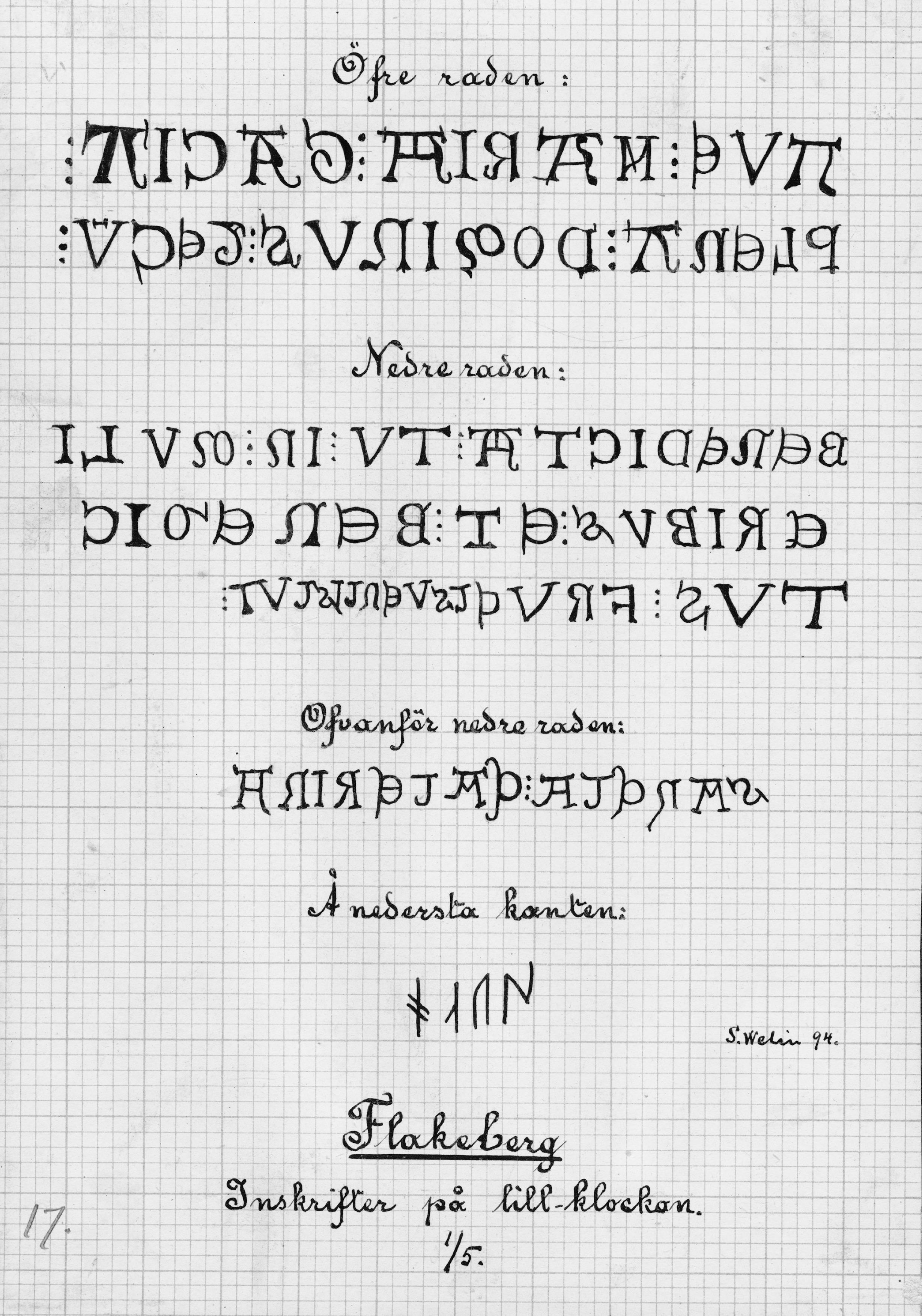 Lillklockan, medeltida, avskrift av texten på klockan, av Sanfrid Welin, 1894.