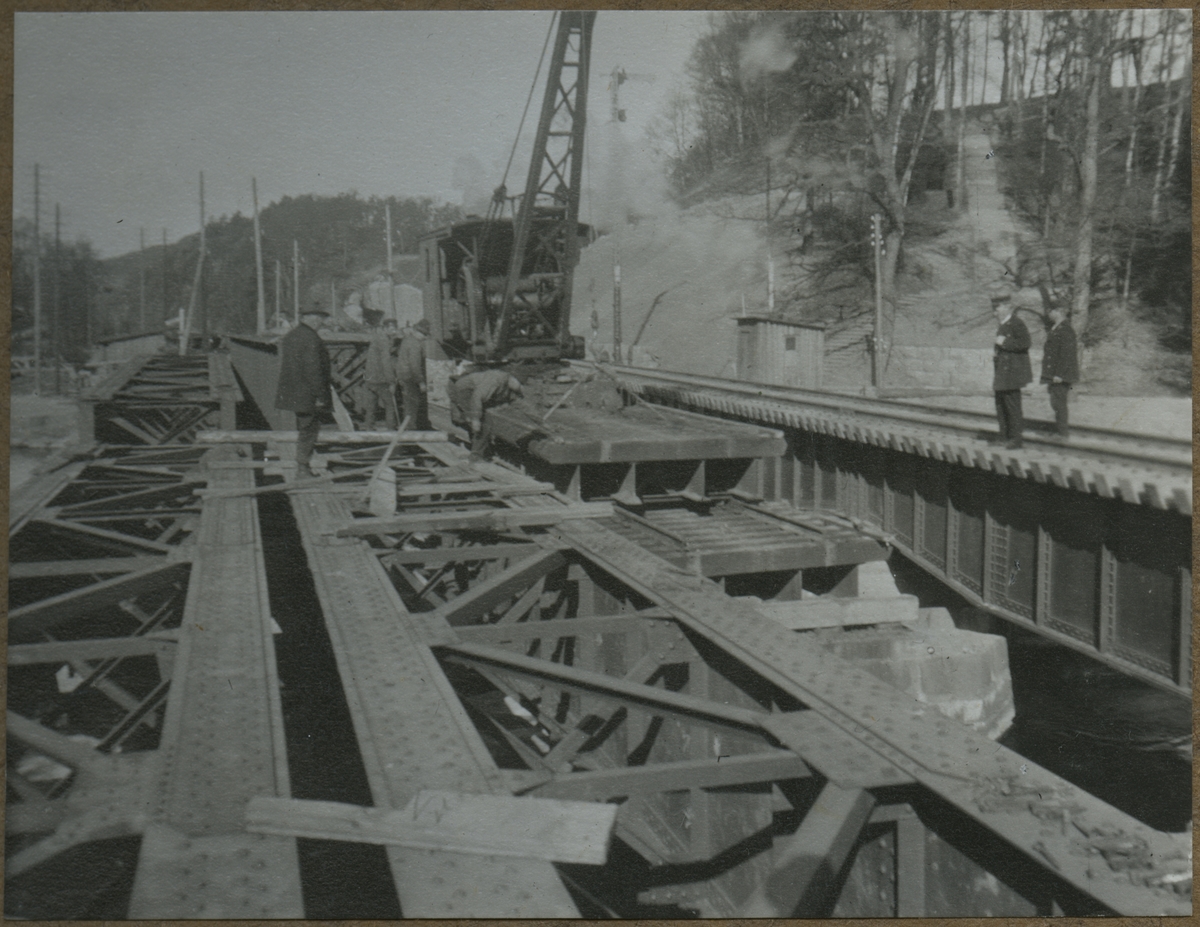 Dubbelspårsbyggnaden mellan Alingsås - Olskroken. Jonsered bro nummer 010. Gamla överbyggnaden borttages med ångkran.