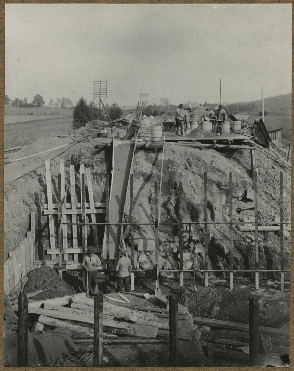 Titel: Dubbelspårsbyggnaden mellan Alingsås - Olskroken. Vägport vid Hede. Betonggjutning för nya vägporten.