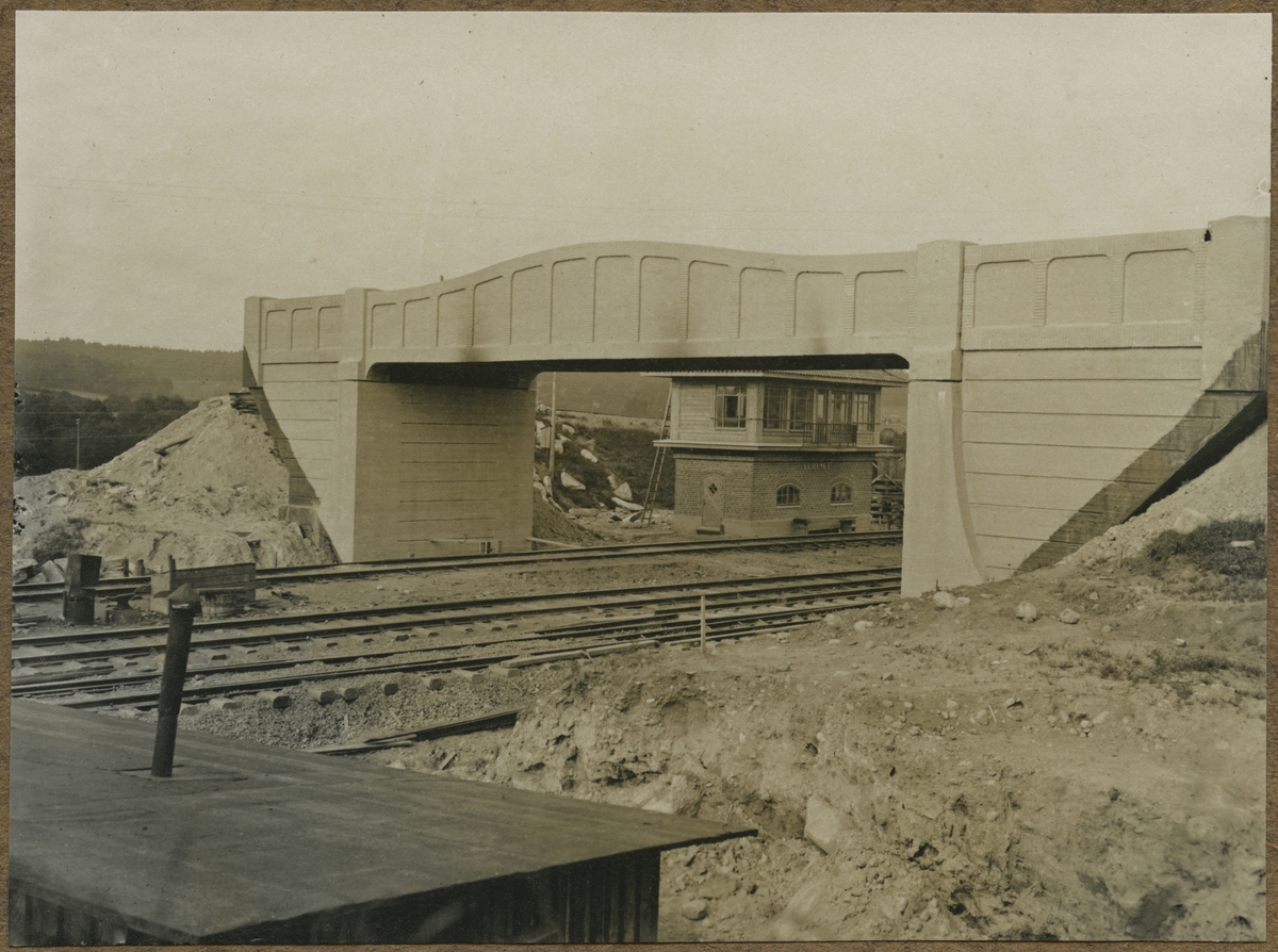 Dubbelspårsbyggnaden mellan Alingsås - Olskroken. Vägbron över västra ändan av Lerums bangård. Vägbron färdig samt det nya ställverkshuset.