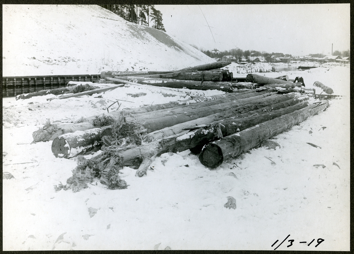 Titel: Brobygge för dubbelspåret över kanalen mellan Rönninge - Ström. Träpålar för pålning av kanalen.