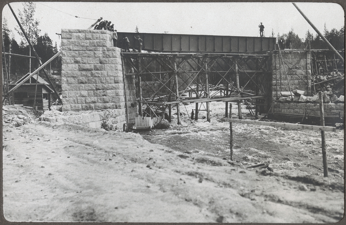 Titel: Bro över Hjuksån. Järnöverbyggnaden inpassas juni 1922 .
