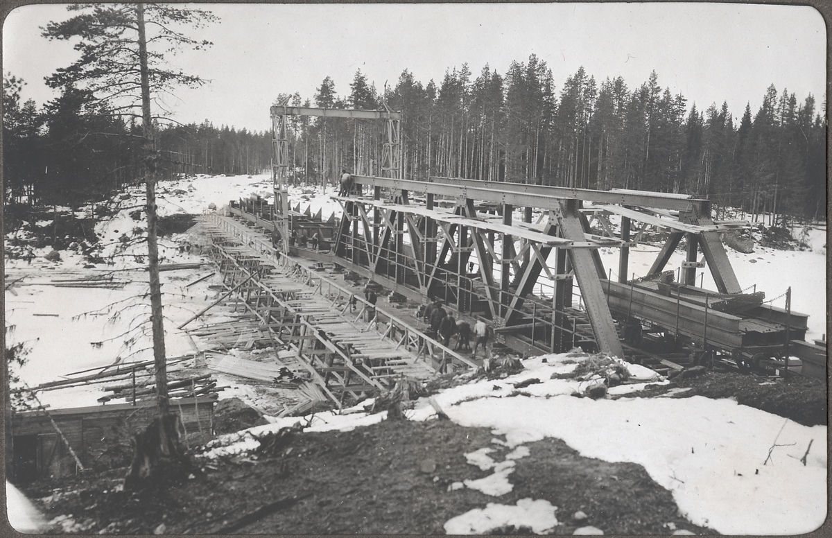 Titel: Bro över Vindelälven. Överbyggnaden uppsättes mars 1923.