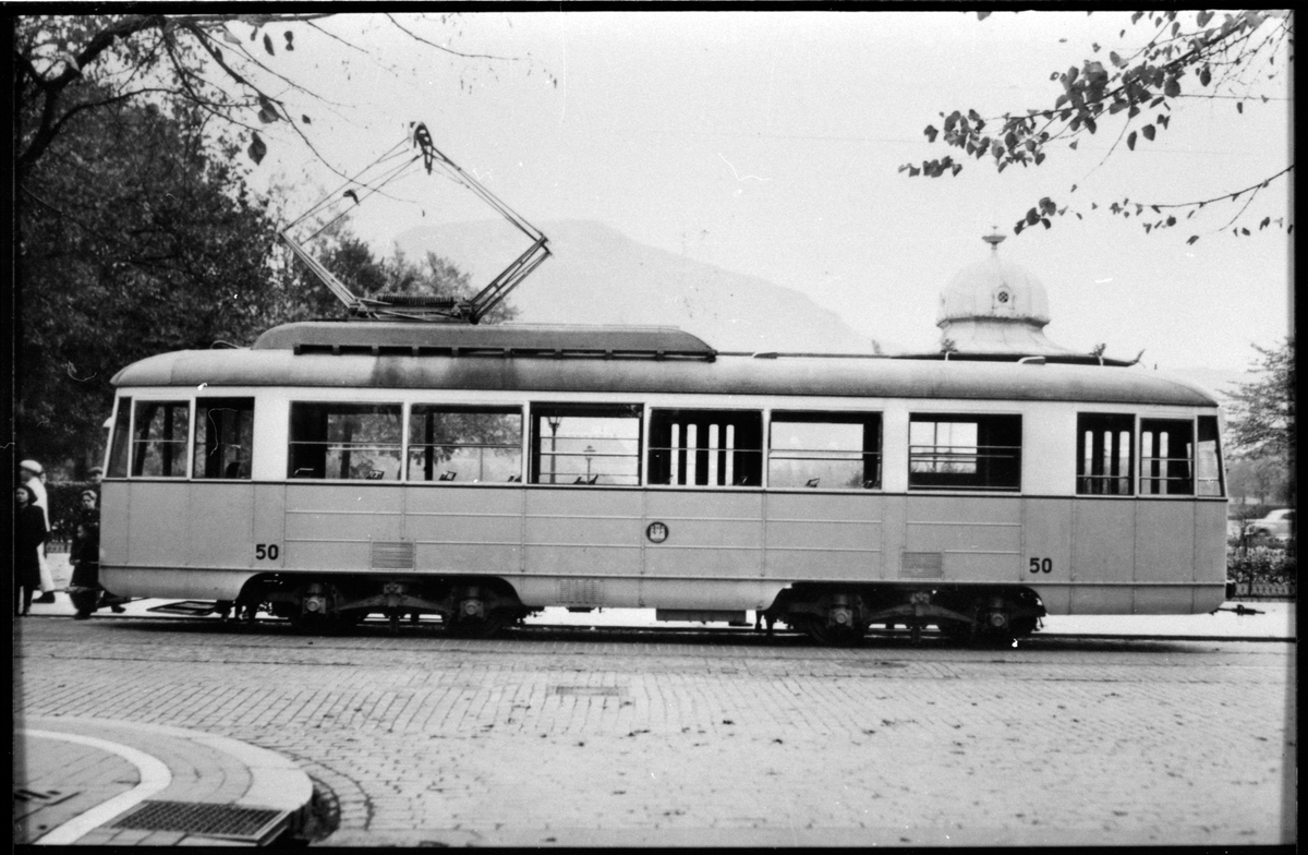 Titel: Bergen Sporvei AS spårvagn 50 vid hållplats i Bergen.