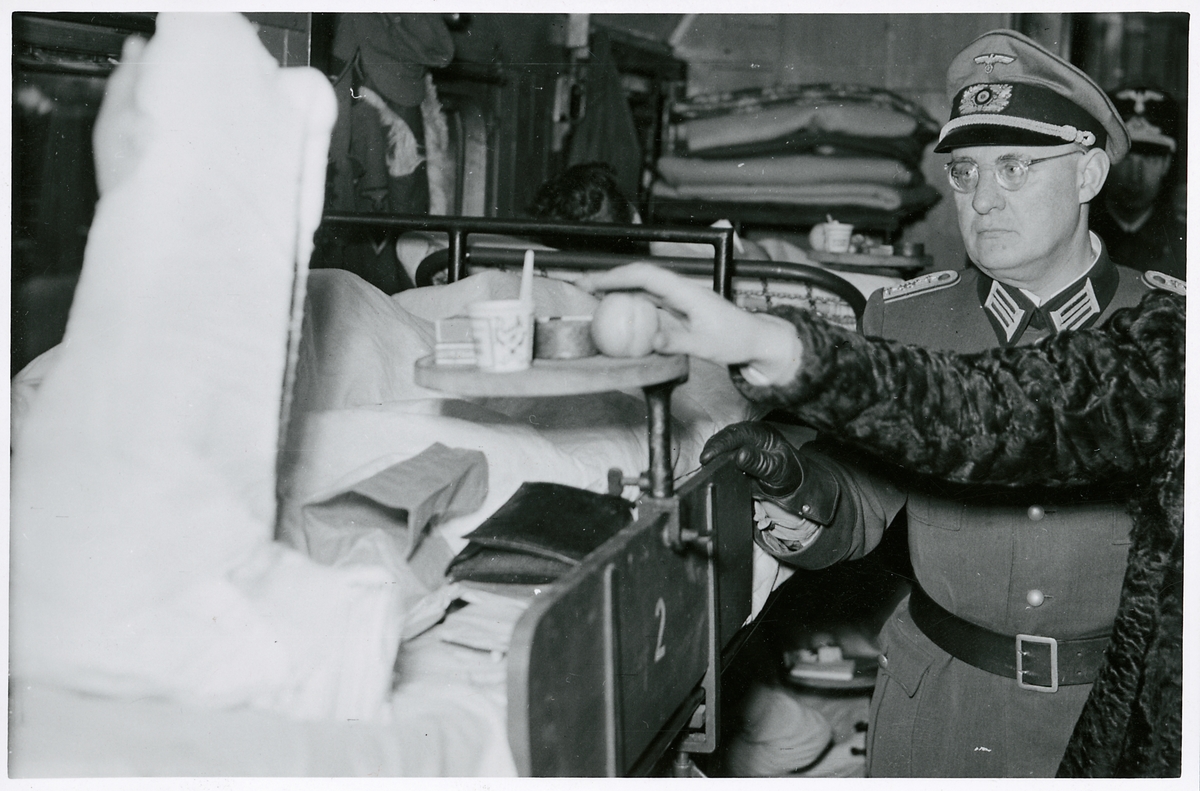 Prinsessan Sibyllas besök på tyskt sjukhuståg i Krylbo 13 november 1941 i sällskap med tysk nazistofficer.