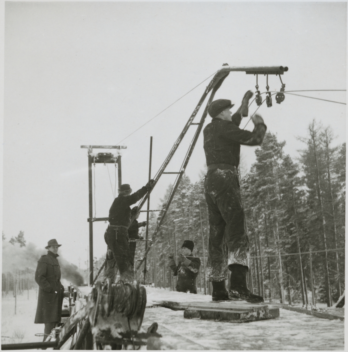 Titel: Kontaktledning monteras i vinterförhållanden.