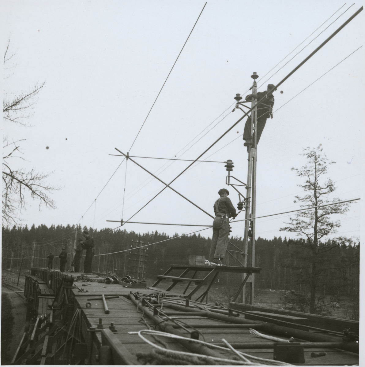 Kontaktledningsmontage, justering av kontaktledningen under elektrifiering av Trafikaktiebolaget Grängesberg - Oxelösunds Järnvägar, TGOJs banor.