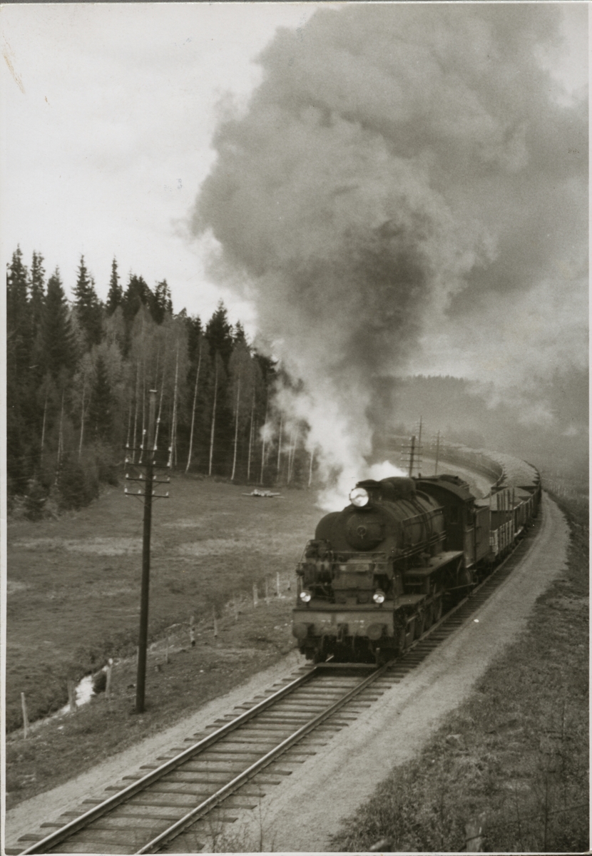 Trafikaktiebolaget Grängesberg - Oxelösunds Järnvägar, TGOJ M3t 73 framför ett antal malmvagnar i en uppförsbacke.