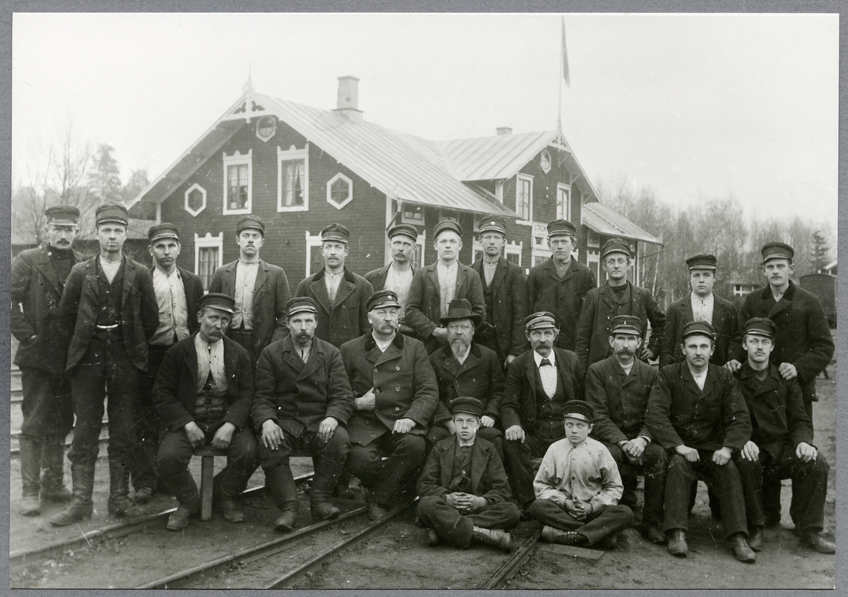 Verkstadsarbetare vid Sävsnäs Järnväg, SVJ, utanför stationshuset i Strömsdal.
