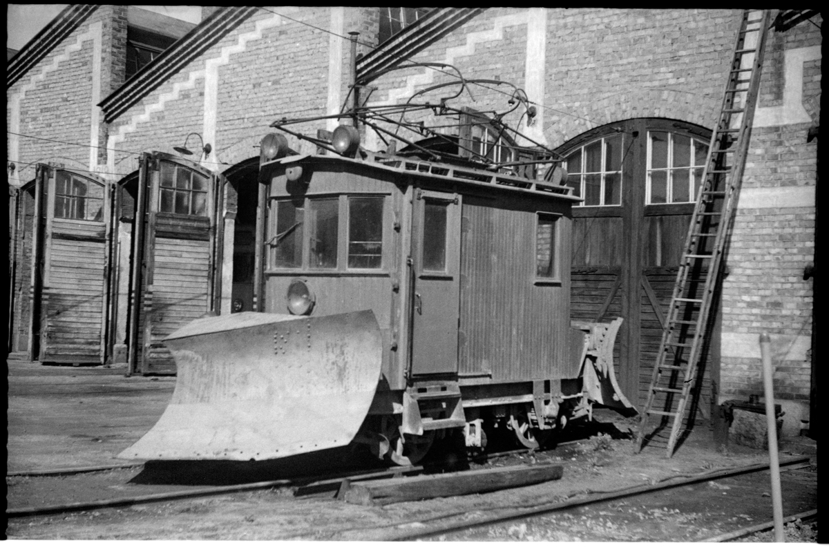 Snöplog på spårvagn utanför vagnhallen i Rosenborg, Östermalm, i Sundsvall 1949-08-08.