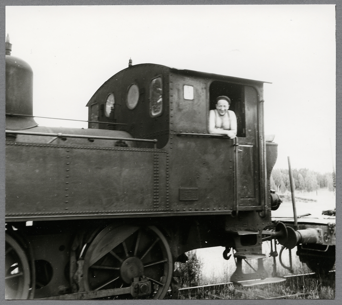 Titel: Lokförare i förarhytten på ett ånglok.