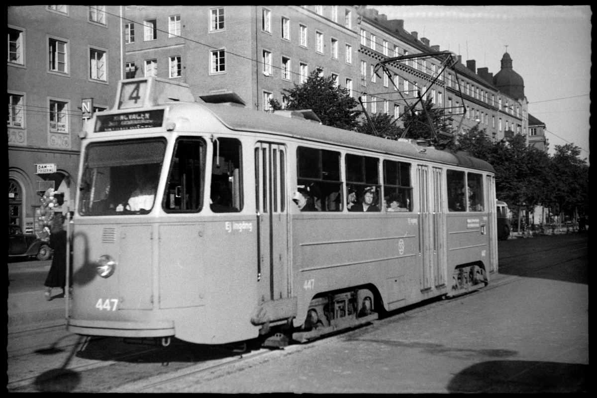 Aktiebolaget Stockholms Spårvägar, SS A25 447 "mustang" vid hållplats Ringvägen, linje 4.