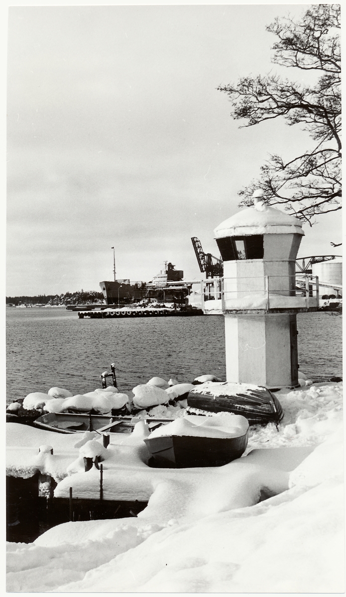 Titel: Fyr och malmlastningskajen i Oxelösunds hamn i bakgrunden.