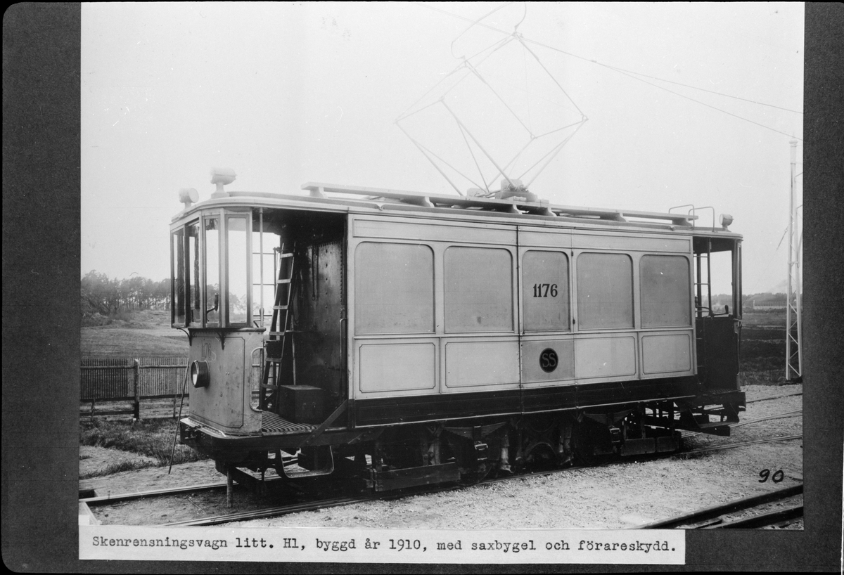 Aktiebolaget Stockholms Spårvägar, SS H1 1176 skenrensingsvagn med förareskydd och saxbygel.