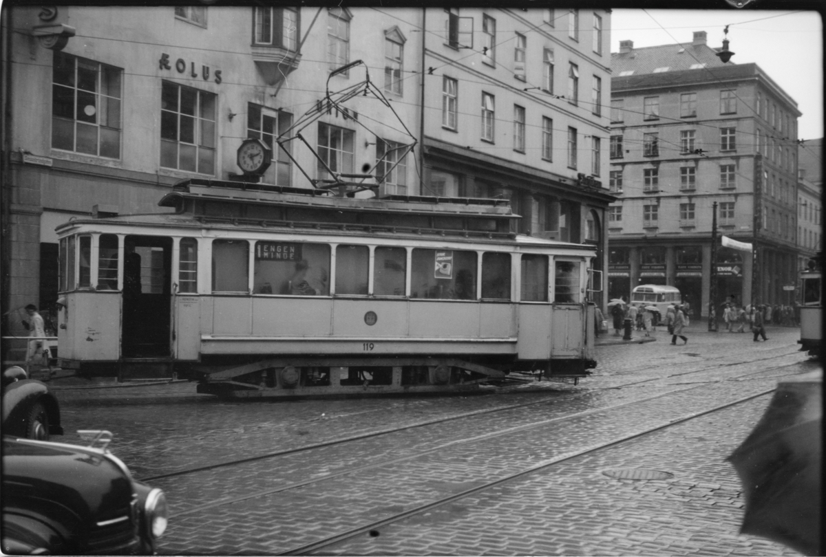 Bergen Sporvei Aktieselskabet, BS spårvagn 119 på Småstrandgaten i trafik på linje 1 - Engen - Minde.