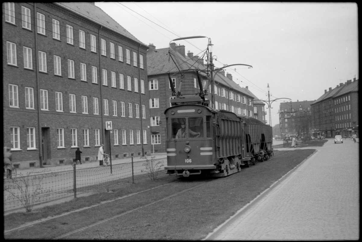 Malmö Stads Spårvägar, MSS koltransportvagn 106 med släpvagn på Föreningsgatan i Malmö.