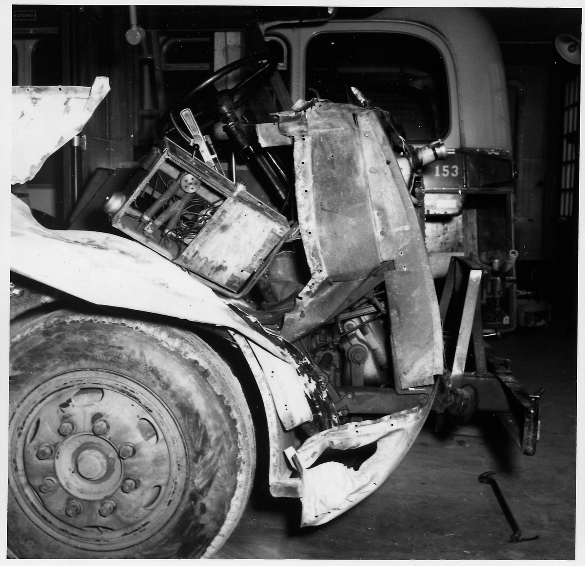 Detaljer på krockskadad buss, Statens Järnvägars, SJ 850.