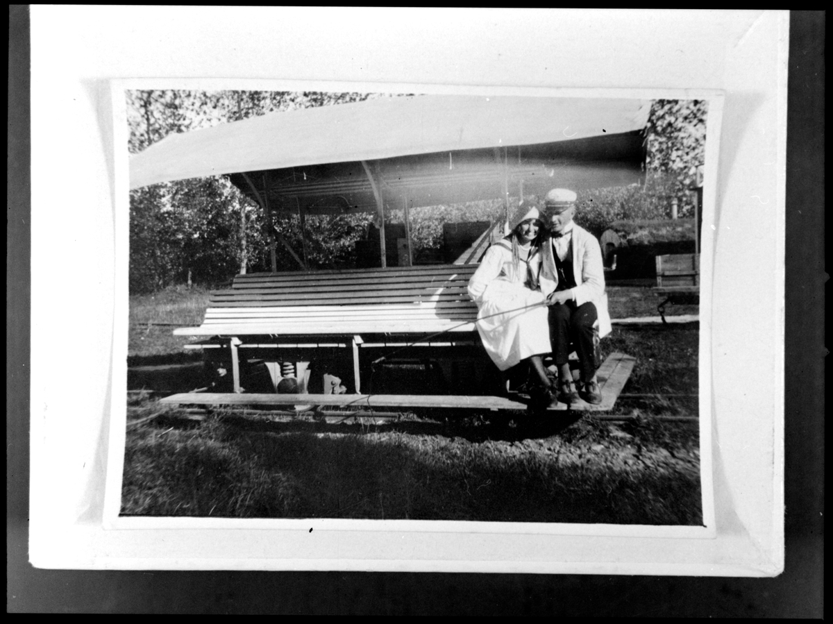 Vagnarna, 2 st för hästdrift tillverkade 1911 av Petersens Mekaniska verkstad i Trelleborg. På vagnen stins Anderberg och fröken Holmgren sedemera fru Persson gift med lokförare Persson i Falsterbo.